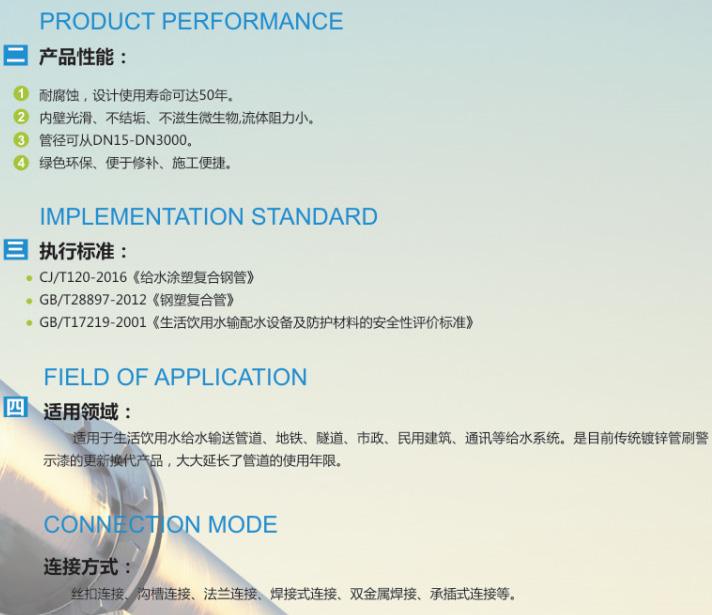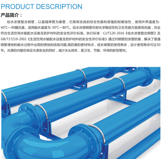 簡介:給水涂塑復合鋼管,以直縫焊管為基管,它具有優(yōu)良的綜合性能和很強的耐腐蝕性,使用外界溫度為-40℃-90攝氏度,適用輸水溫度為30℃-80℃.給水涂塑鋼管在耐化學穩(wěn)定性和衛(wèi)生性能方面表現(xiàn)優(yōu)越,完全符合生活飲用水輸配水設備及防護材料的安全性評價標準。