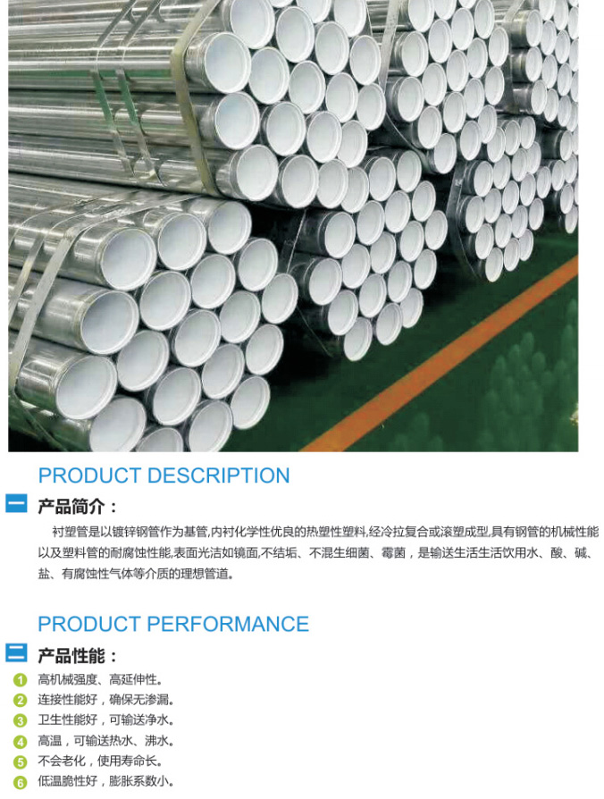 簡(jiǎn)介:襯塑管是以鍍鋅鋼管作為基管,內(nèi)襯化學(xué)性優(yōu)良的熱塑性塑料,經(jīng)冷拉復(fù)合或滾望成型,具有鋼管的機(jī)械性能以及塑料管的耐腐蝕性能,表面光潔如鏡面,不結(jié)垢、不混生細(xì)菌、霉菌,是輸送生活生活飲用水、酸、堿、鹽、有腐性性氣體等介質(zhì)的理想管道